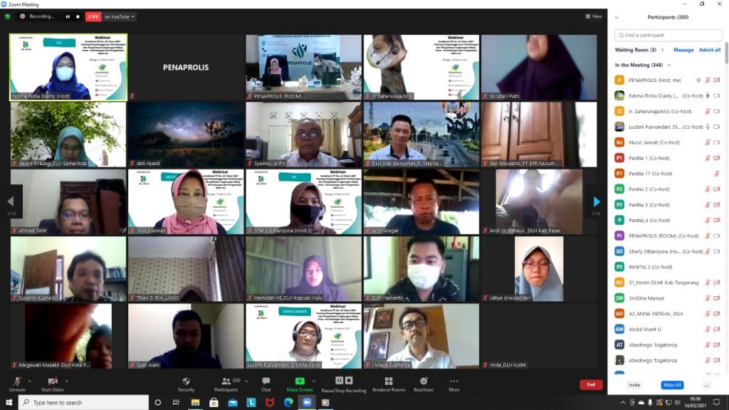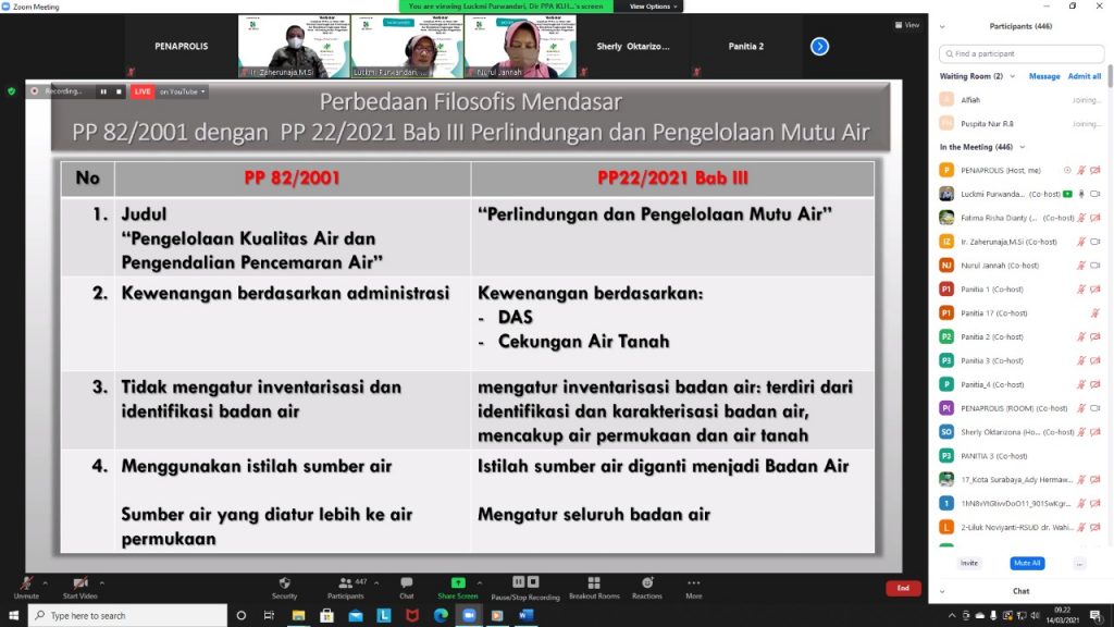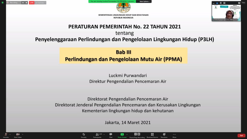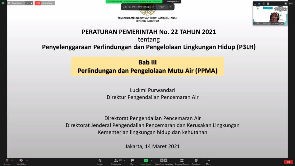 Webinar : Sosialisasi PP 22 Tahun 2021 Tentang Penyelenggaraan Perlindungan dan Pengelolaan Lingkungan Hidup Tema : Dokumen Lingkungan. Senin, 8 Maret 2021